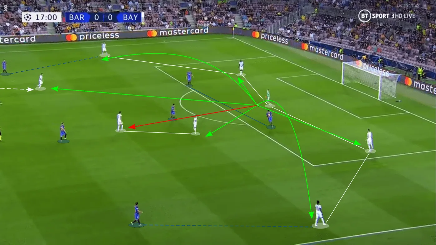 All of this contributed to a complete disaster of a high block, where Barcelona were barely able to cut off one passing option and incessantly conceded transition after transition, where Bayern’s superior individual qualities took the spotlight.