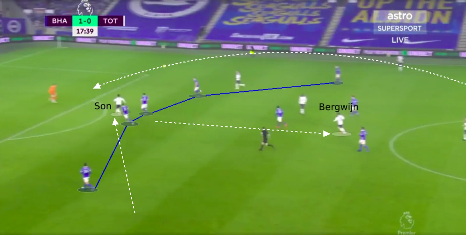 However, the issue here was that Bergwijn could not pull the Brighton defence out of shape. He moved back so deep that he entered the Brighton midfield, with the fact that their lines were compact in the first place further helping that. So, as you will see next, the Seagulls’ midfielders dealt with Bergwijn.