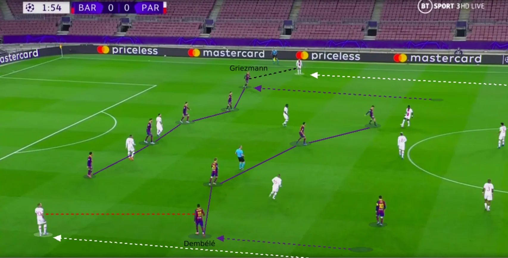 The Barcelona wingers dropped back in order to track the advancing PSG full-backs. Griezmann did this job a lot better, sometimes even going as far back as the defensive line in order to keep Florenzi in check.
