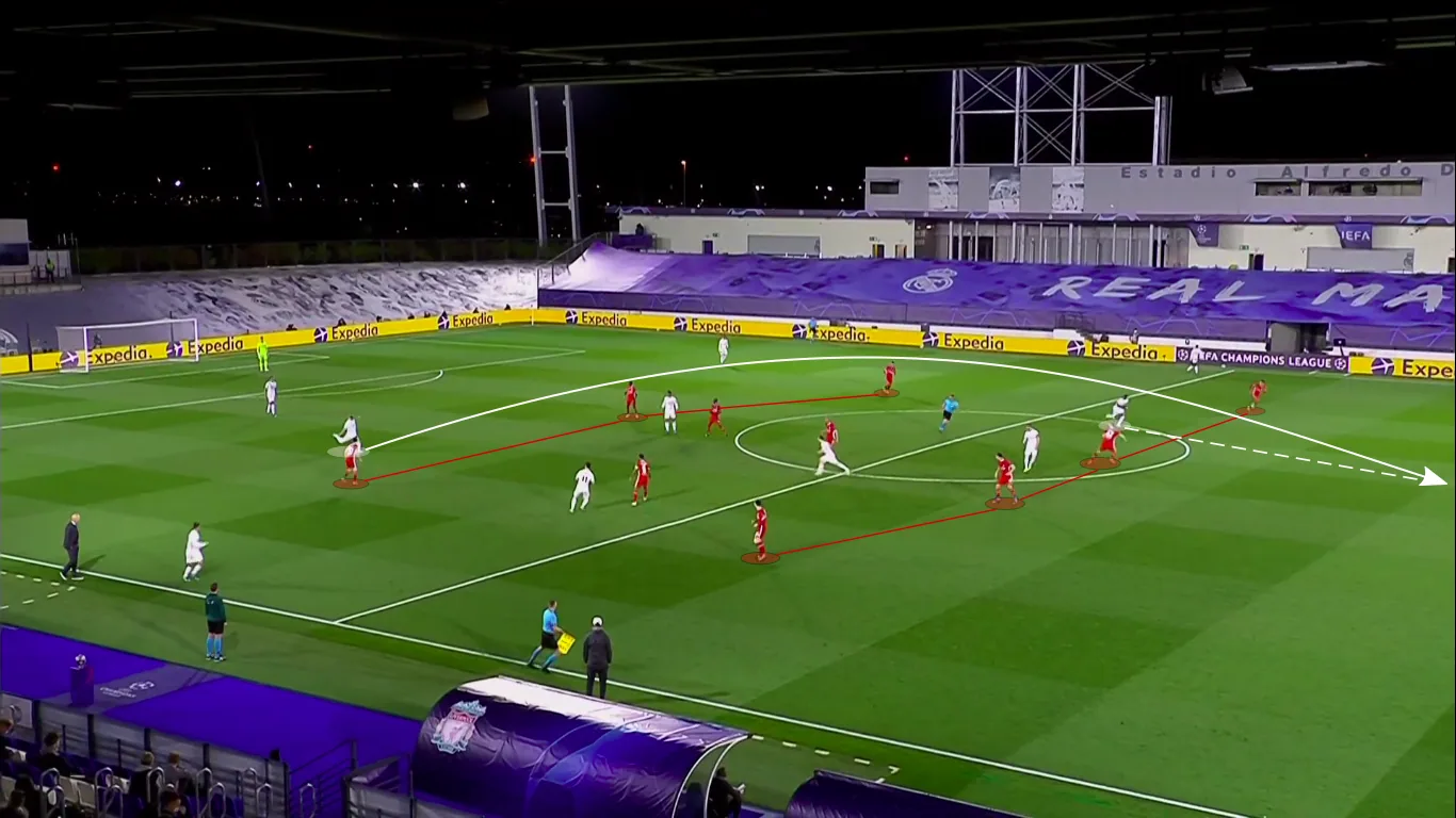 Mendy pushed further forward than Lucas Vázquez on the opposite flank, and with the already-narrow Liverpool midfield occupied with Casemiro and Luka Modrić, crossfield balls to the left were often the way forward for Madrid as Alexander-Arnold would have to contend with both Mendy and Vinícius.