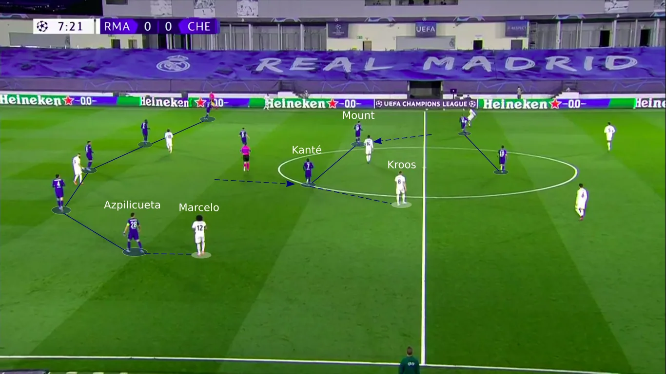 Mason Mount dropped off the front line, while N’Golo Kanté pushed further up than Jorginho to mark Kroos if he ventured into the midfield. The back-five remained quite positionally disciplined, although César Azpilicueta departed from it quite often as he was tasked with man-marking Marcelo.