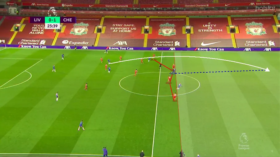 In other cases, Werner dropped back, freeing up Mount to push forward and chase the long balls. This particular instance led to the only goal of the match, as Mount cut inside against Fabinho and brilliantly found the bottom corner.