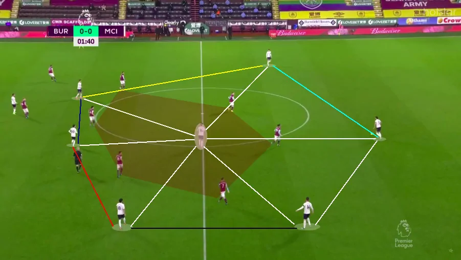 You can see a 3-1-3-3 in possession above (note that Kyle Walker was the right-back in this match, so Zinchenko was used as an inverted left-back). The wingers hold their width, while the main midfield line is looking to operate in the half-spaces. Naturally, the midfielders are looking to receive the ball in between the opposition lines.